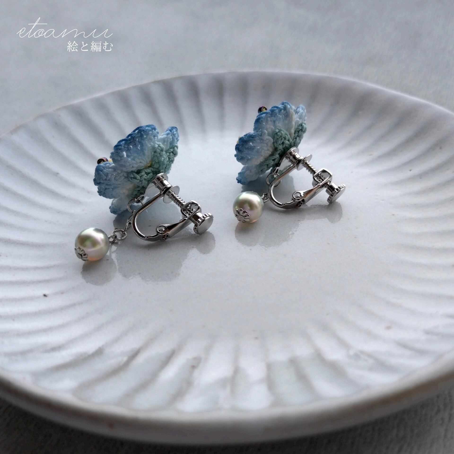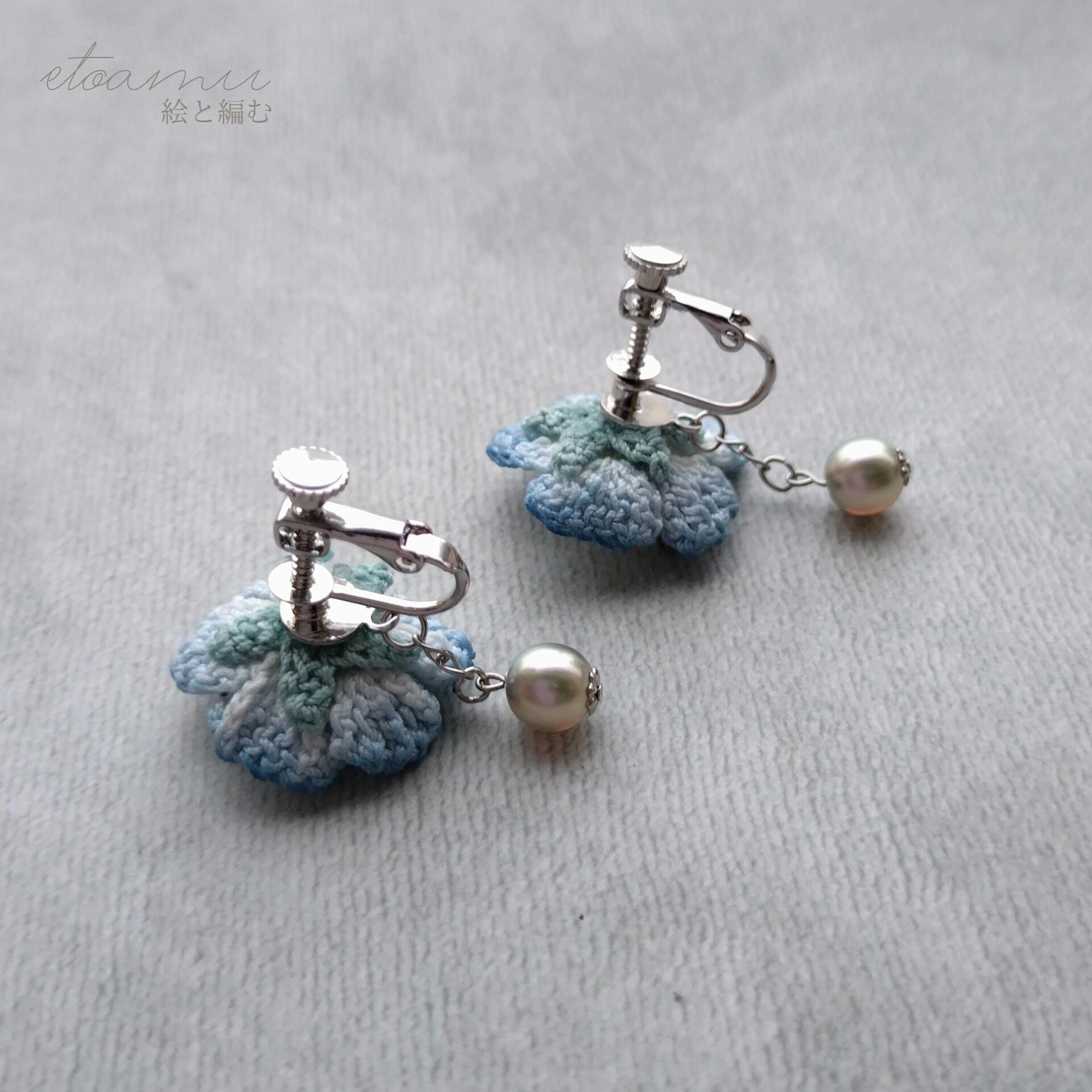 手染めレースで編んだお花に、しずくのようなパールをひと粒添えて、