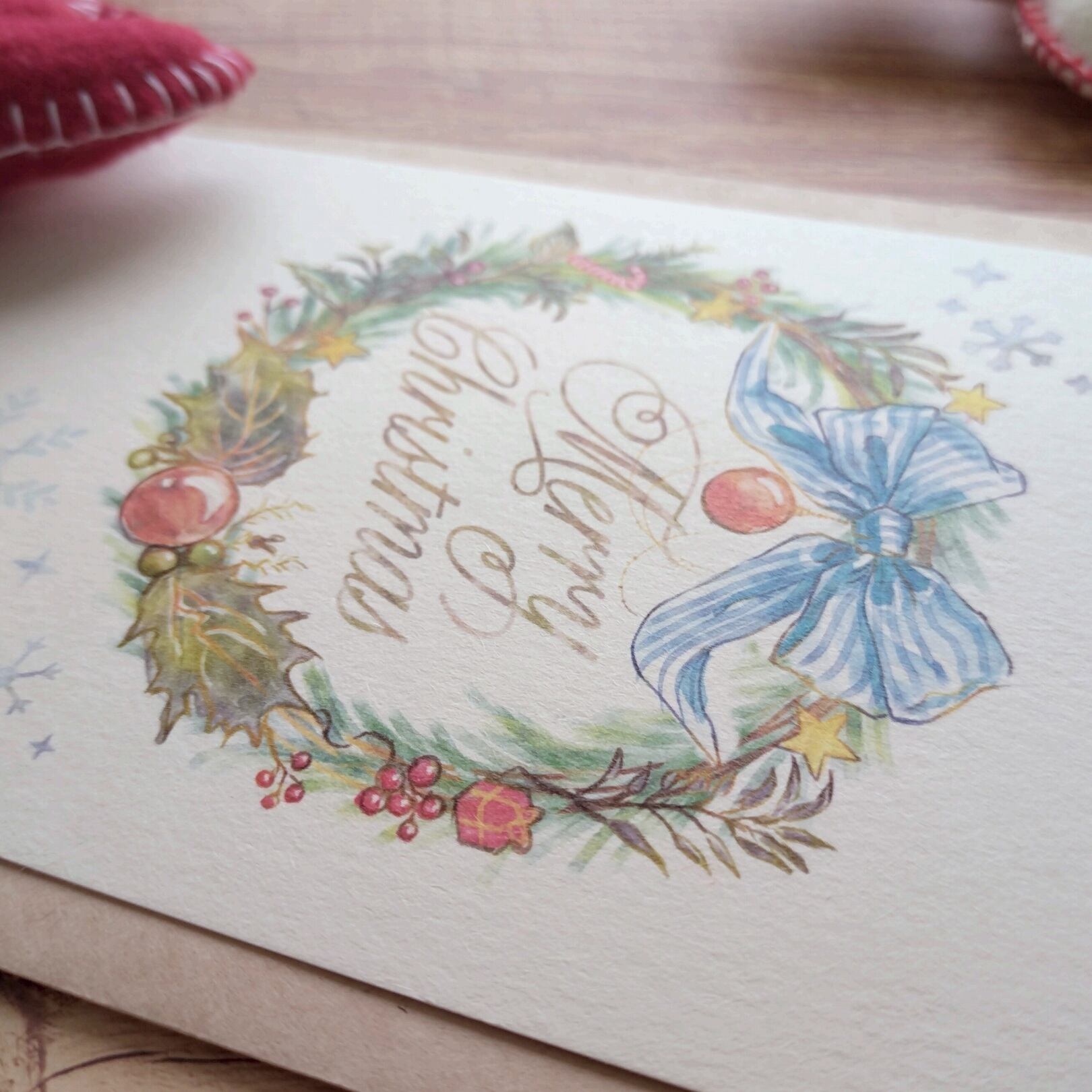 クリスマスシーズンを彩る、やさしいリースのイラストをポストカードにしました。