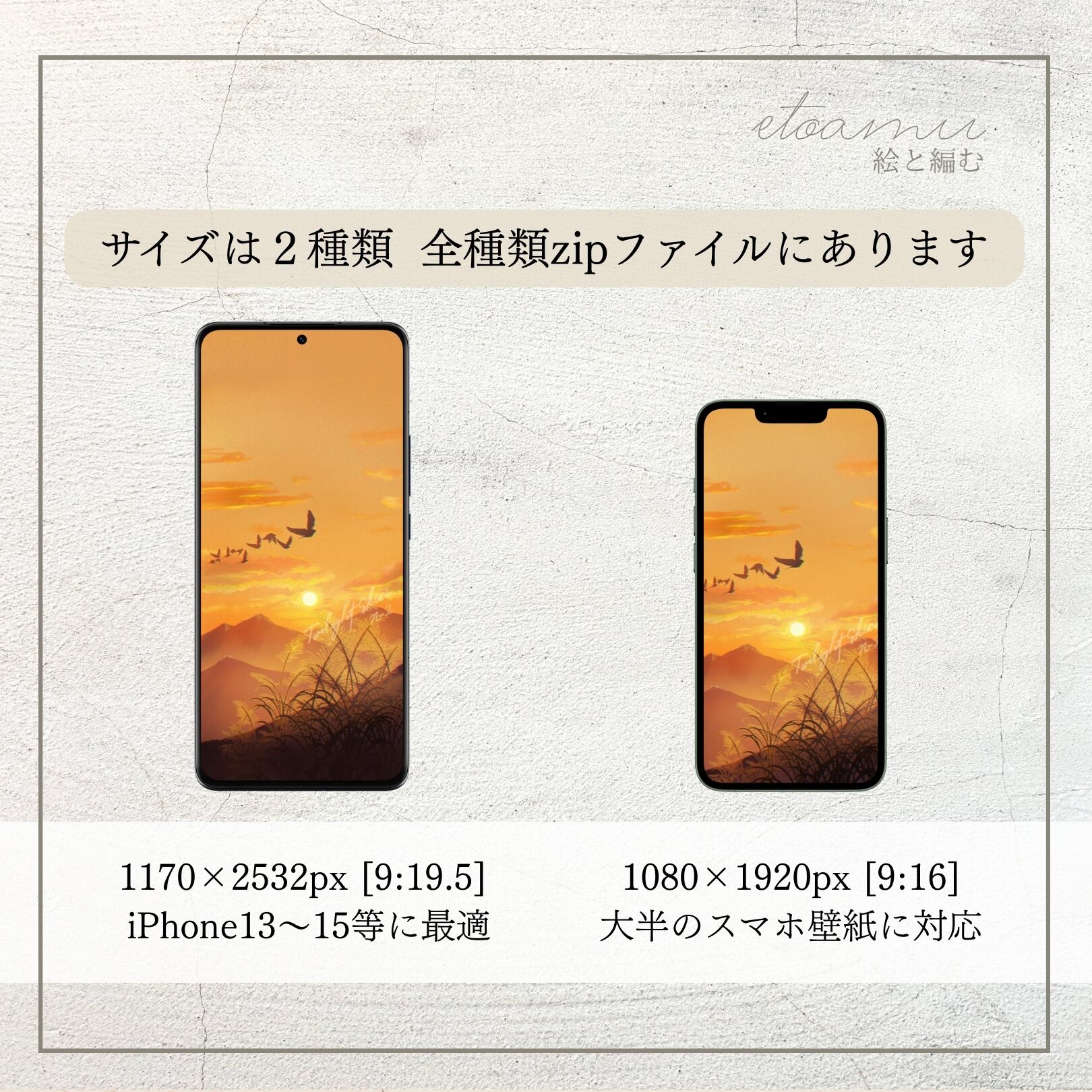 スマホ壁紙 待ち受け 背景画像 デジタルアート 夕焼け 渡り鳥 空 癒し 自然 グラデーション 夕暮れ