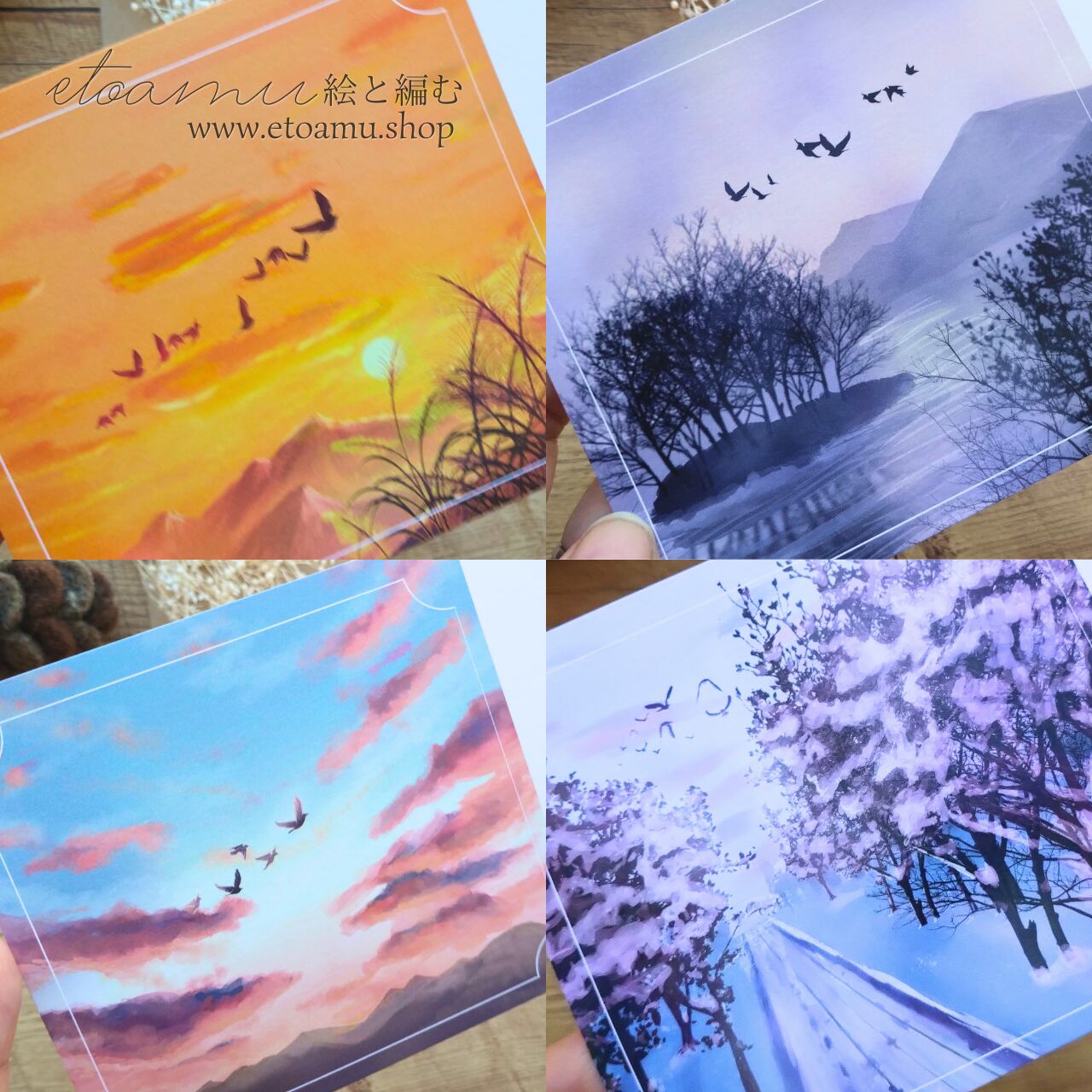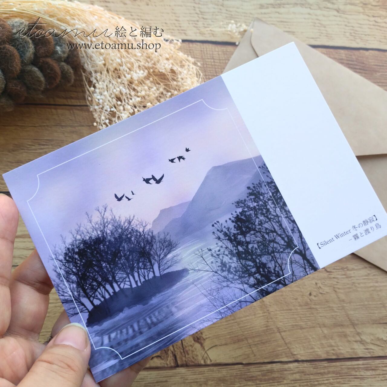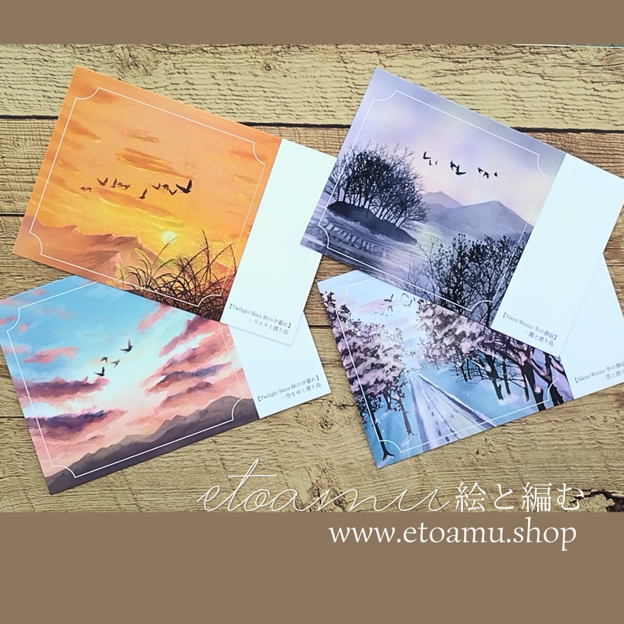 四季の静けさを渡る鳥たち “Birds in the Quiet Seasons” オリジナルアートポストカード|秋・冬 | etoamu-絵と編む|花のアクセサリーとイラスト雑貨のオンラインショップ