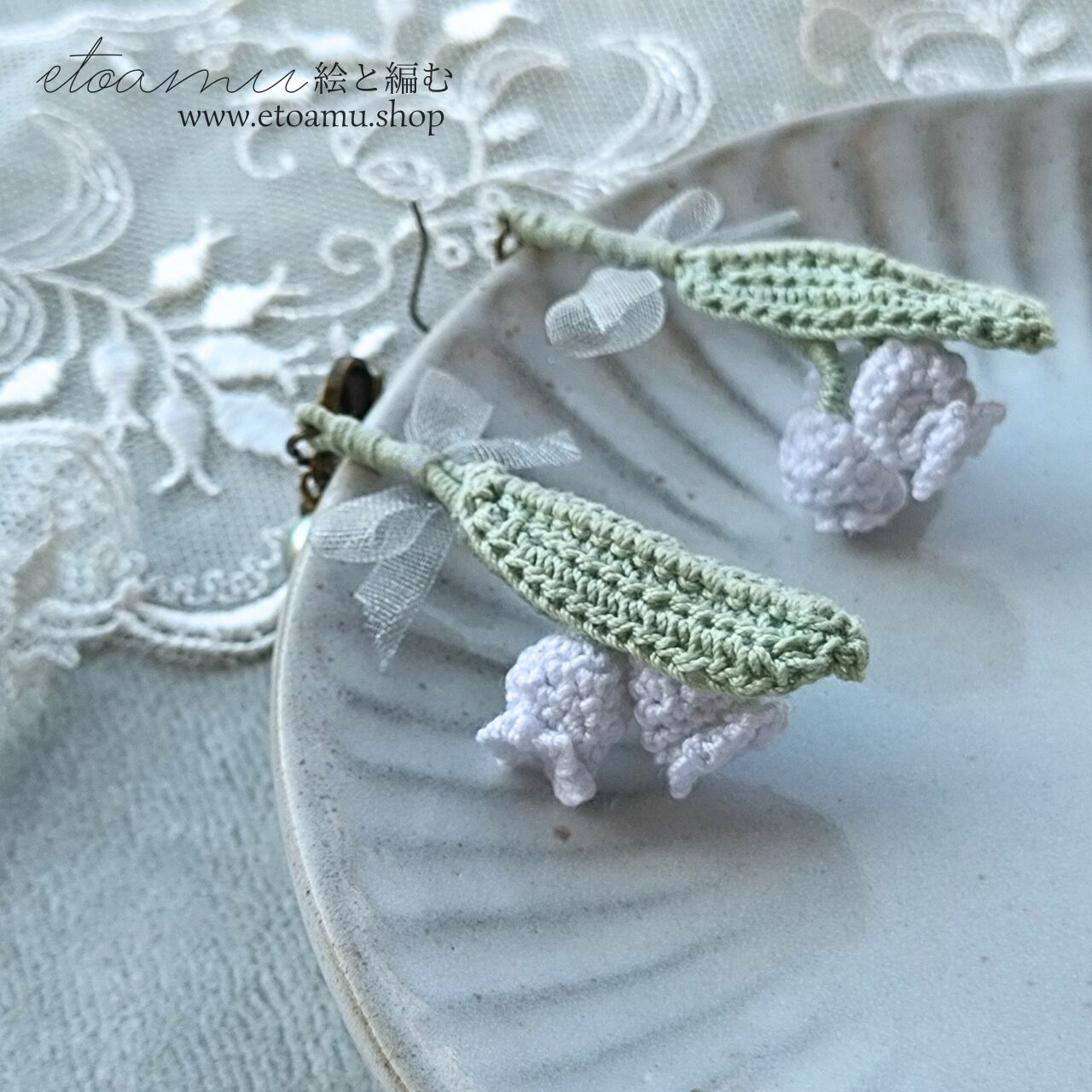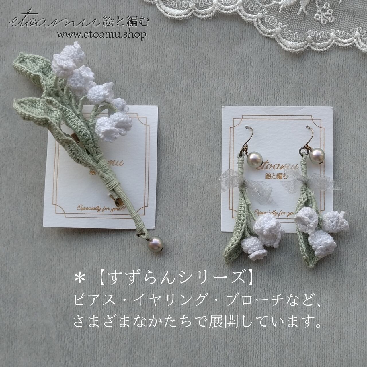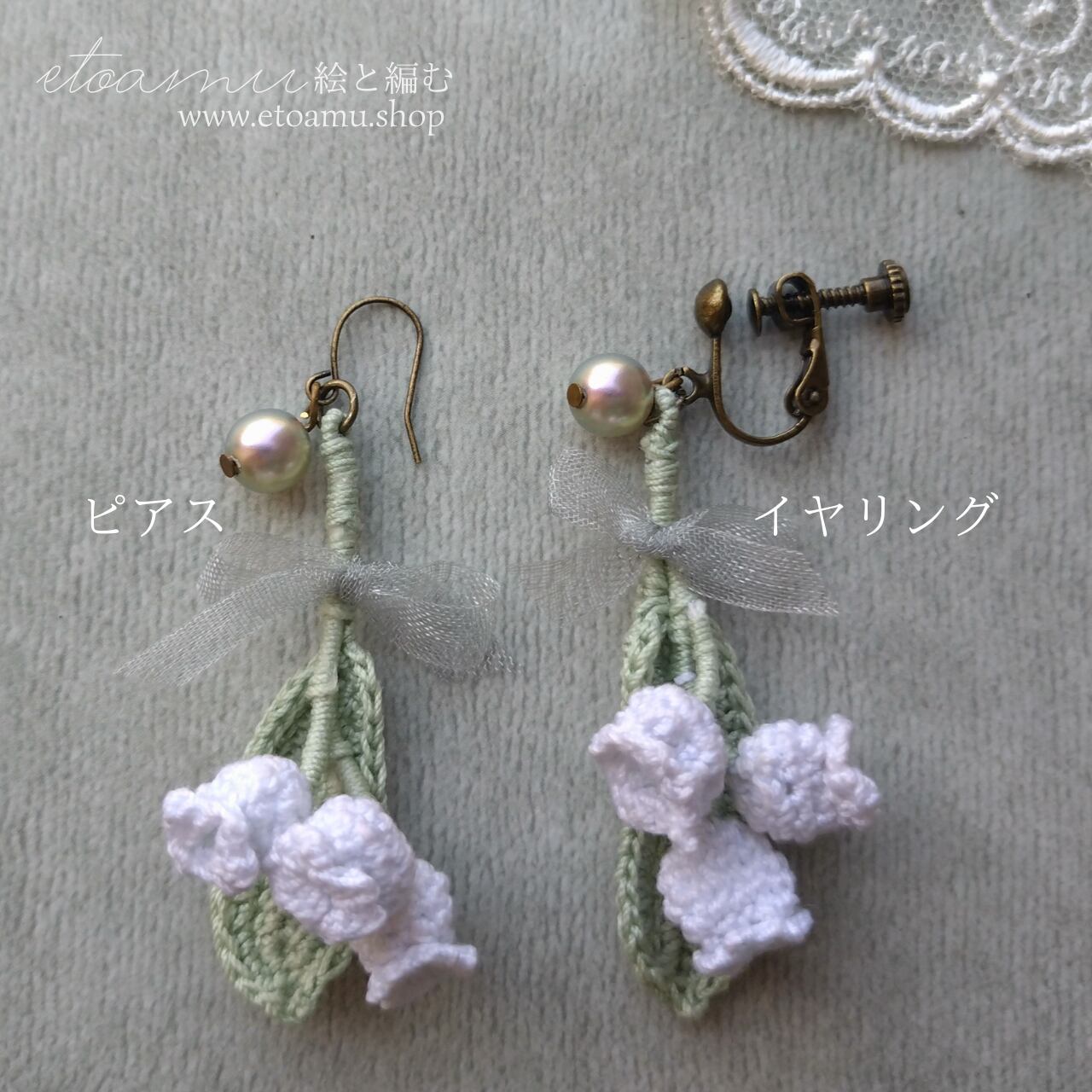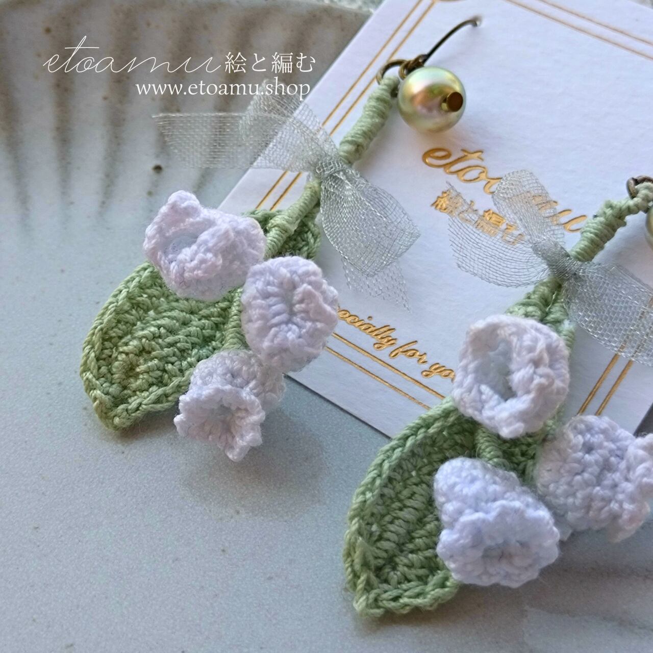 #すずらん#白 #レース編み #春の花 #大人可愛い#手染め#綿#コットン# シンプル# 誕生日#プレゼント#ナチュラル#パール#ギフト記念日#母の日#春コーデ #ブラウンパール #ハンドメイドアクセサリー#友達に贈り物 #ピアス #イヤリング