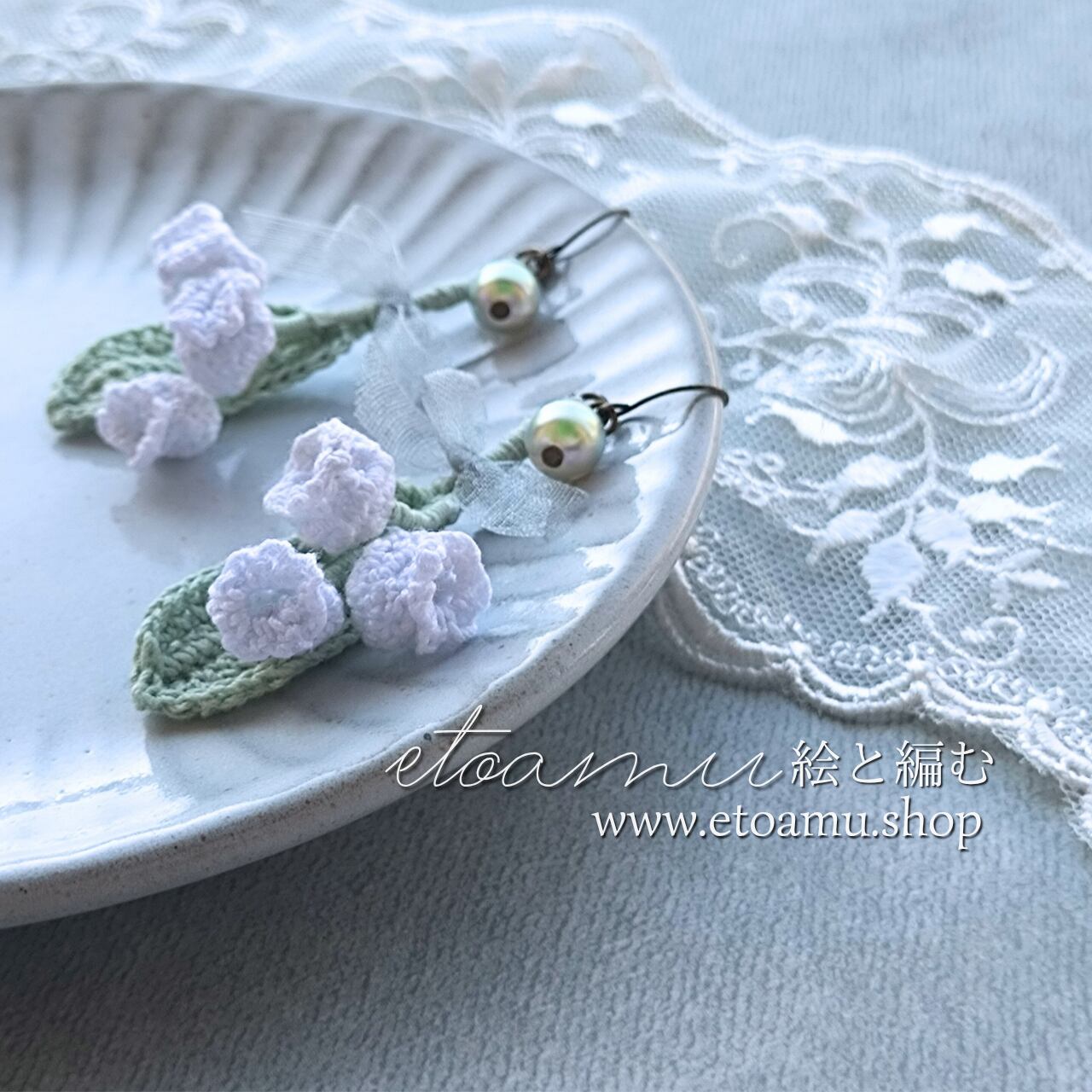 【春の花】すずらんのレース編み×ブラウンパール、静かに揺れる春ピアス/イヤリング|【耳に花いちりん】