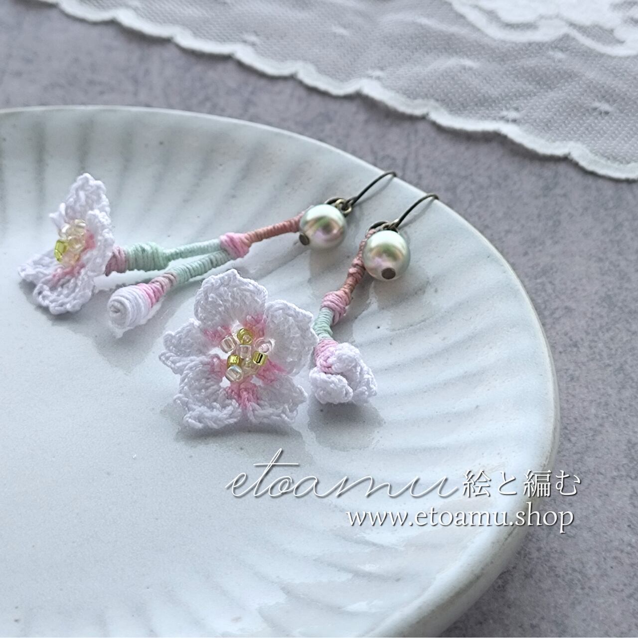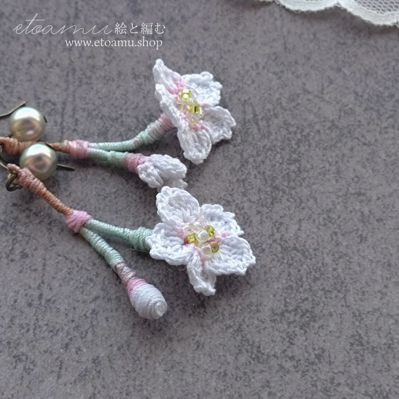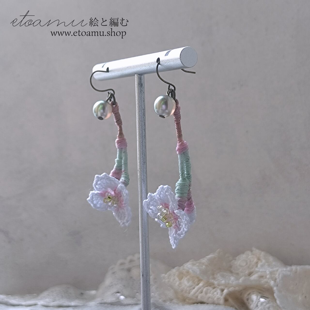 満開よりも、咲きはじめや散り際の儚い桜の姿をイメージして制作したレース編みの一輪ピアスです。