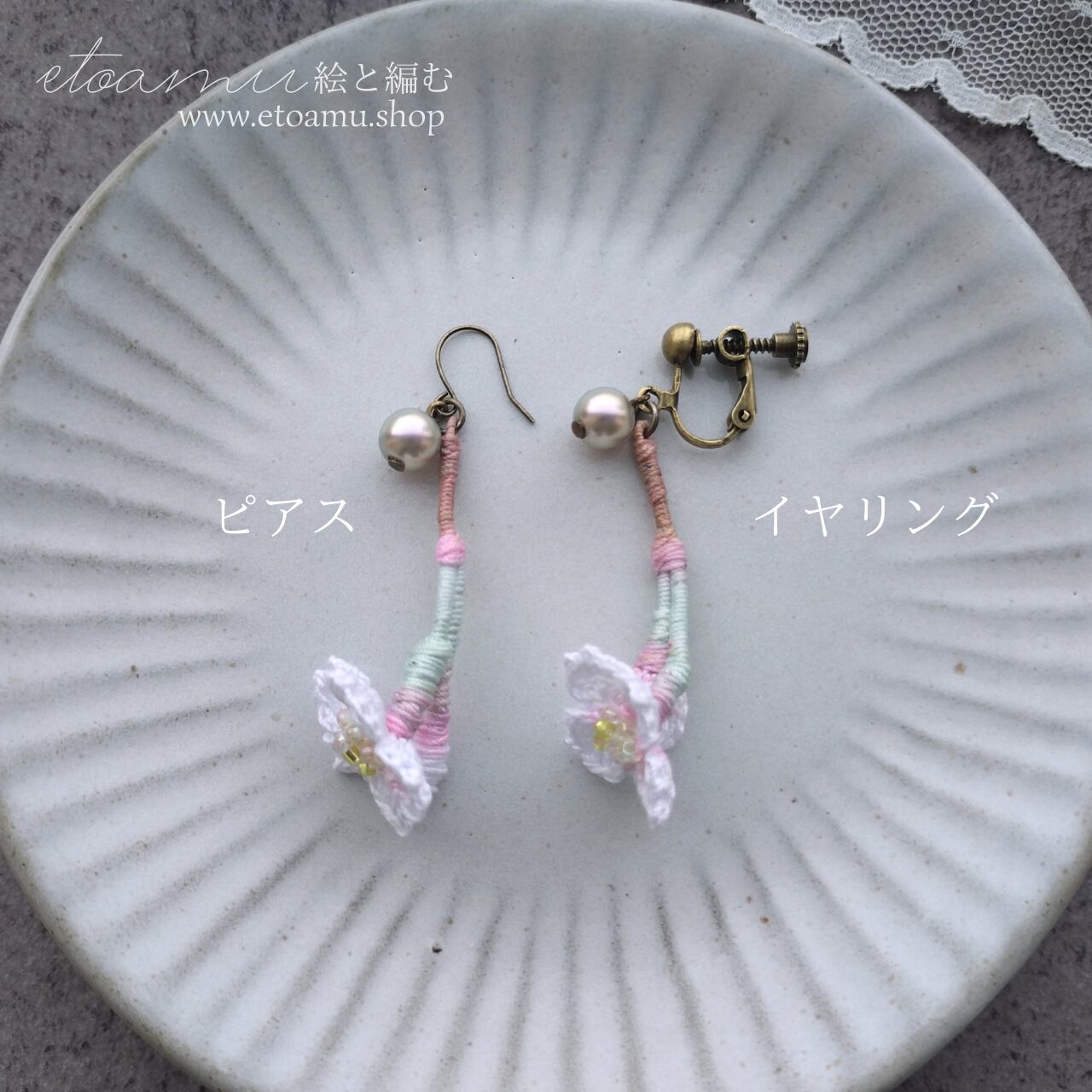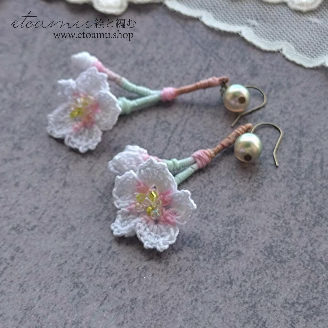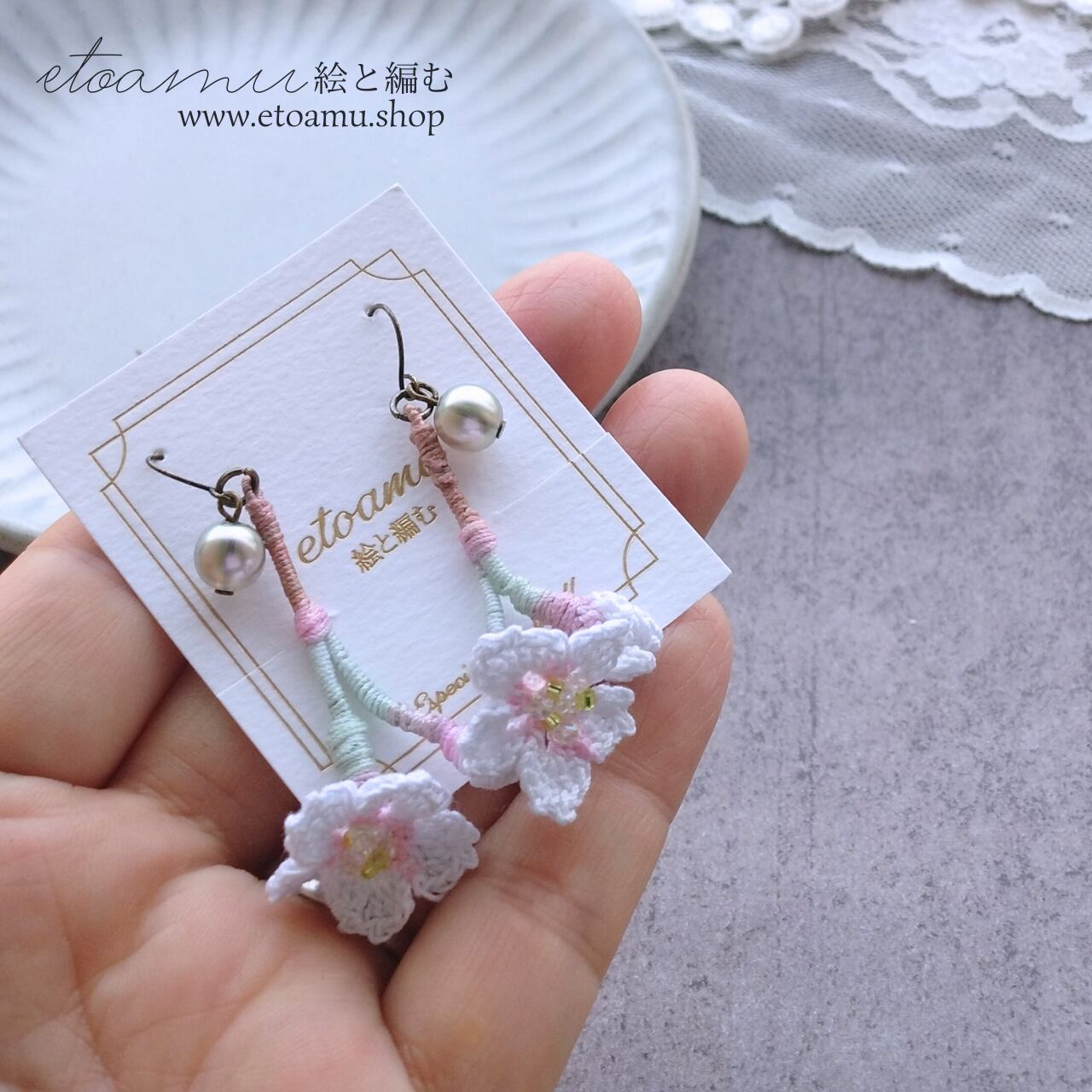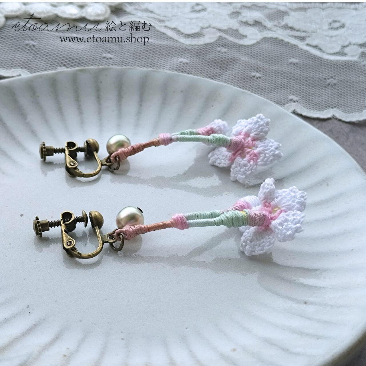 満開よりも、咲きはじめや散り際の儚い桜の姿をイメージして制作したレース編みの一輪ピアスです。