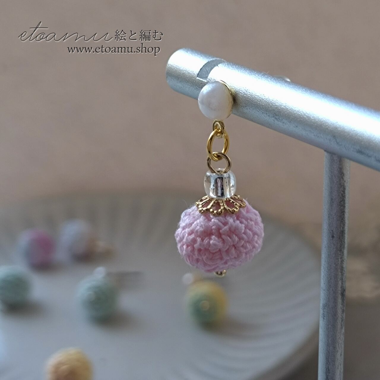 小さめレースボール一粒ピアス/イヤリング|春 軽い ナチュラル【桜色グラデ(ピンク)】手編みレース×コットンパール