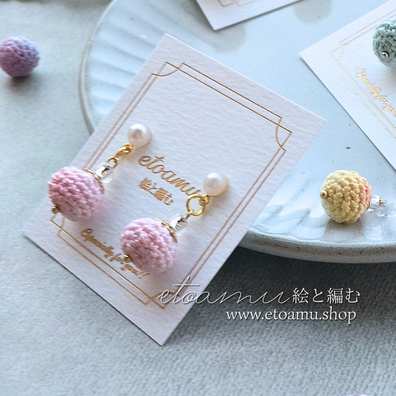 小さなレースボールをひとつずつ丁寧に編み、コットンパールと合わせています。